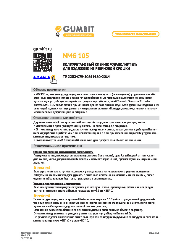 Клей NMG 105 разрешается использовать в школах, детских садах, спортзалах. Полиуретановый состав применяется для приклеивания подложек Tempo к основанию, шпатлевания поверхностей перед нанесением наливных слоёв спортивных покрытий Tornado Tempo и Tornado Master.