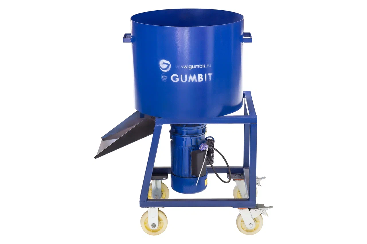 Миксер с электроприводом для производства резиновых покрытий. Перемешивает резиновую крошку, полиуретановое связующее и пигменты в однородную массу за 5 минут. Максимально допустимая разовая загрузка — 90 кг.
